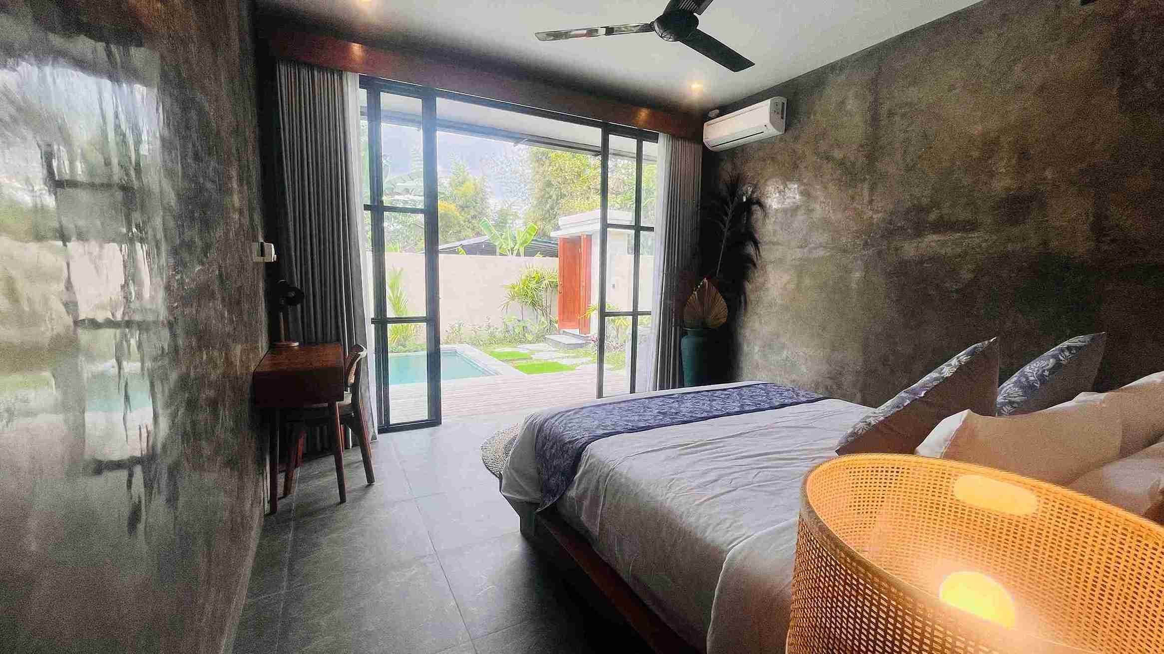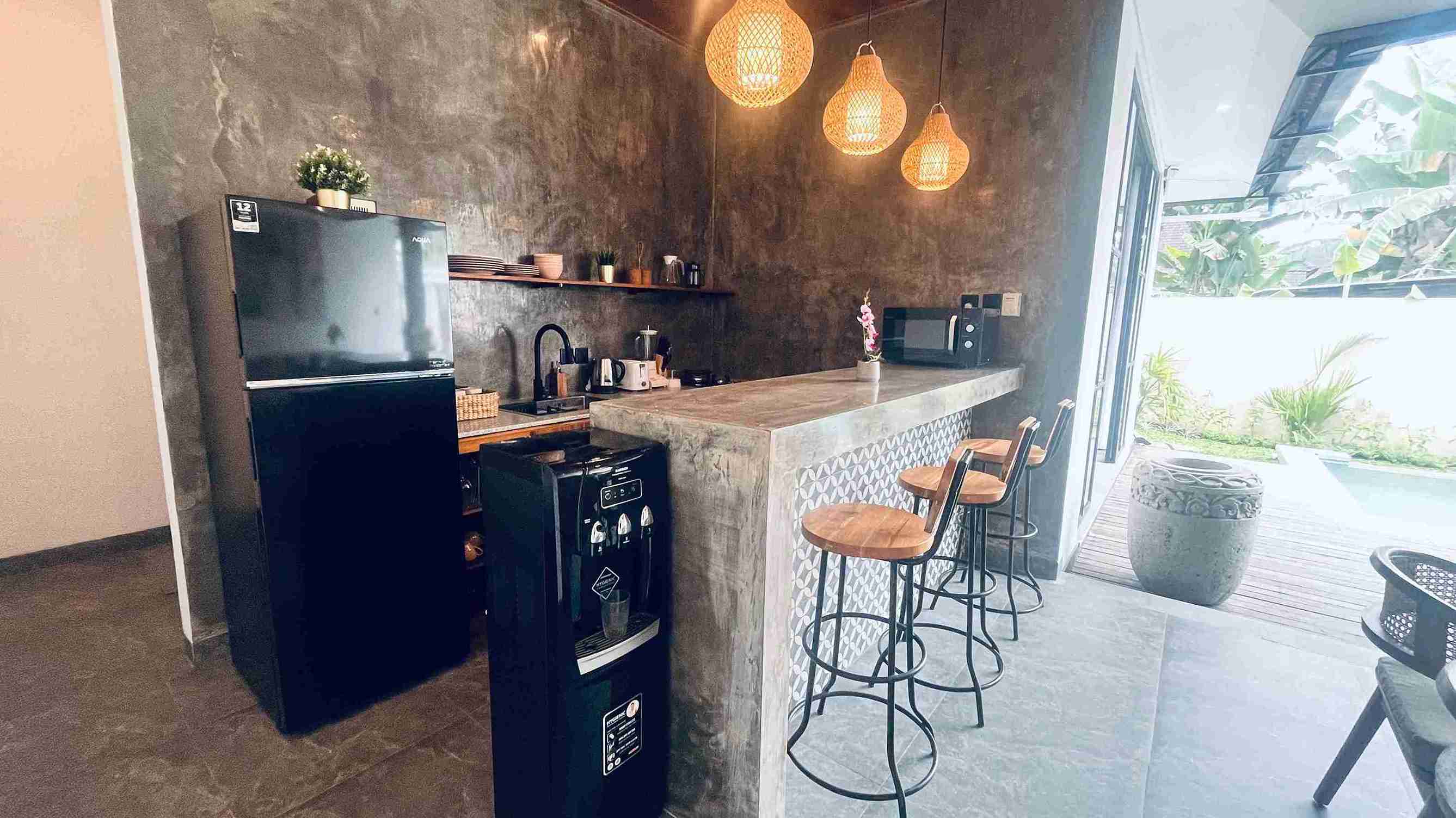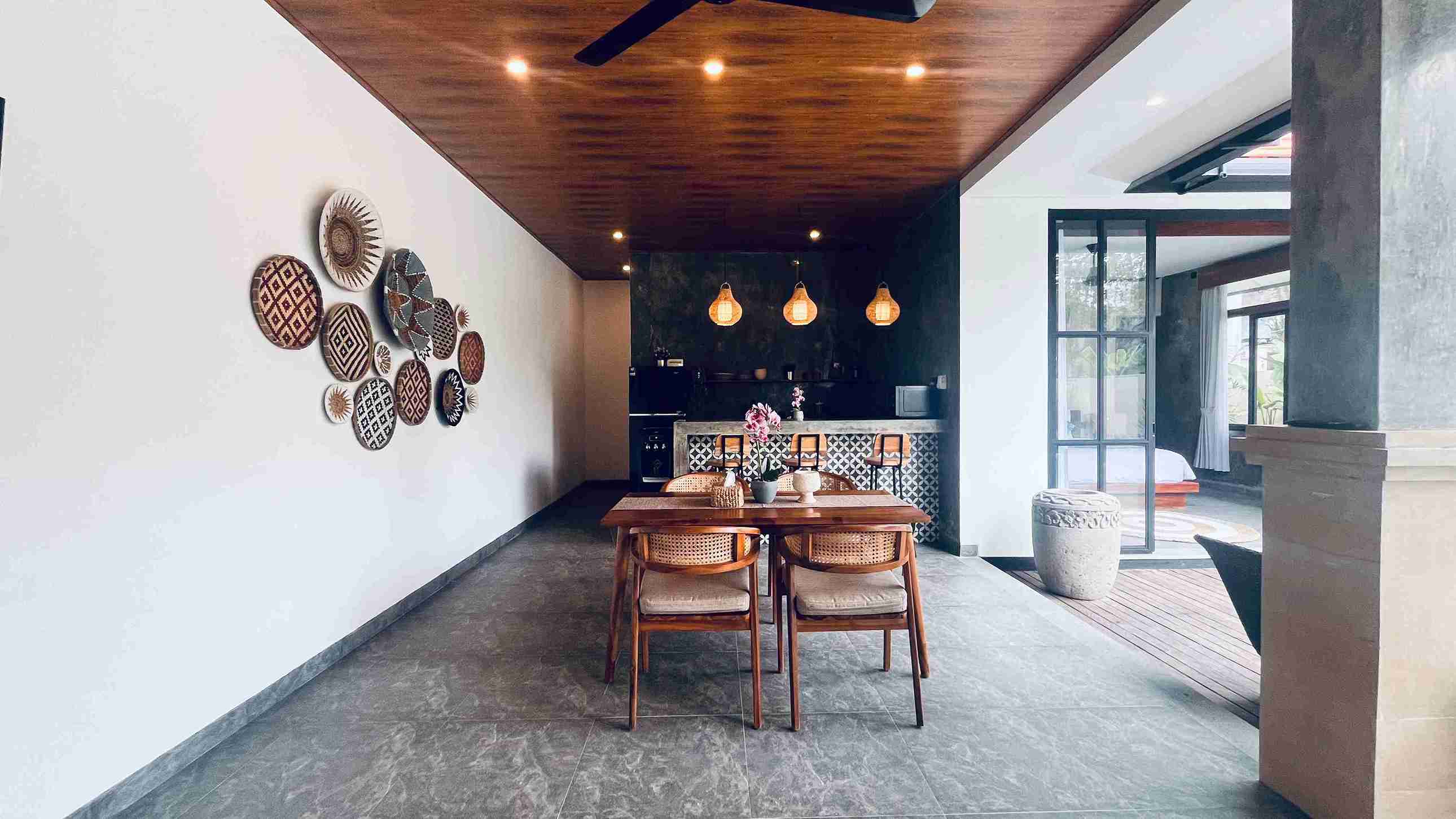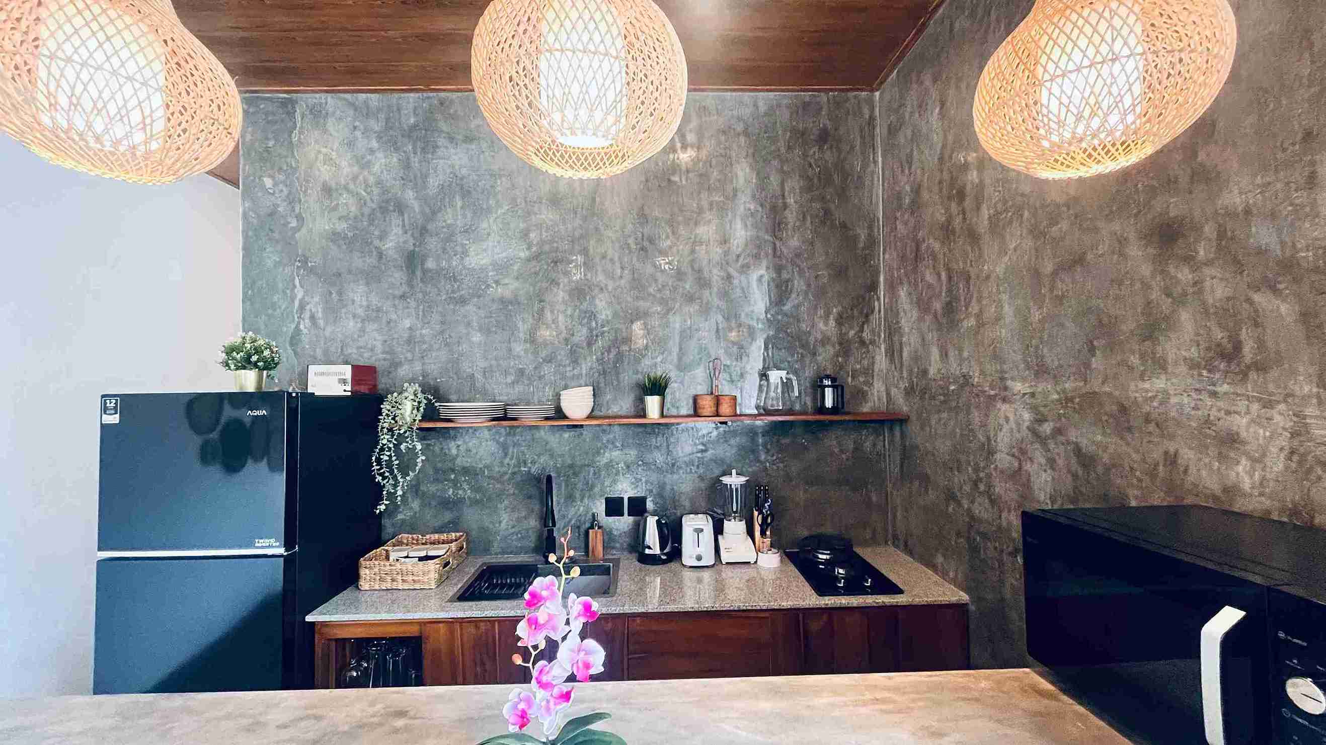 Designed with clean lines and polished cement finishes, the villa offers a minimalist yet warm atmosphere that’s both trendy and tranquil. The open-plan living and dining area flows seamlessly to the outdoor space,