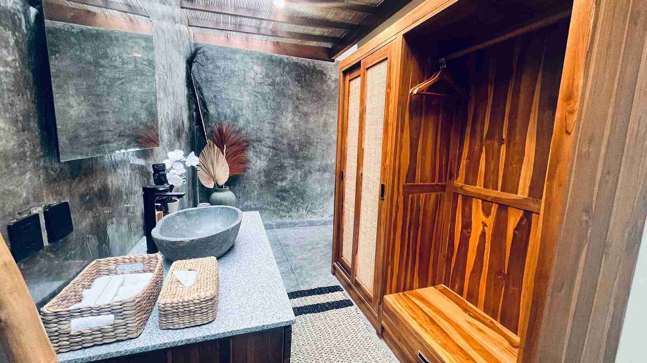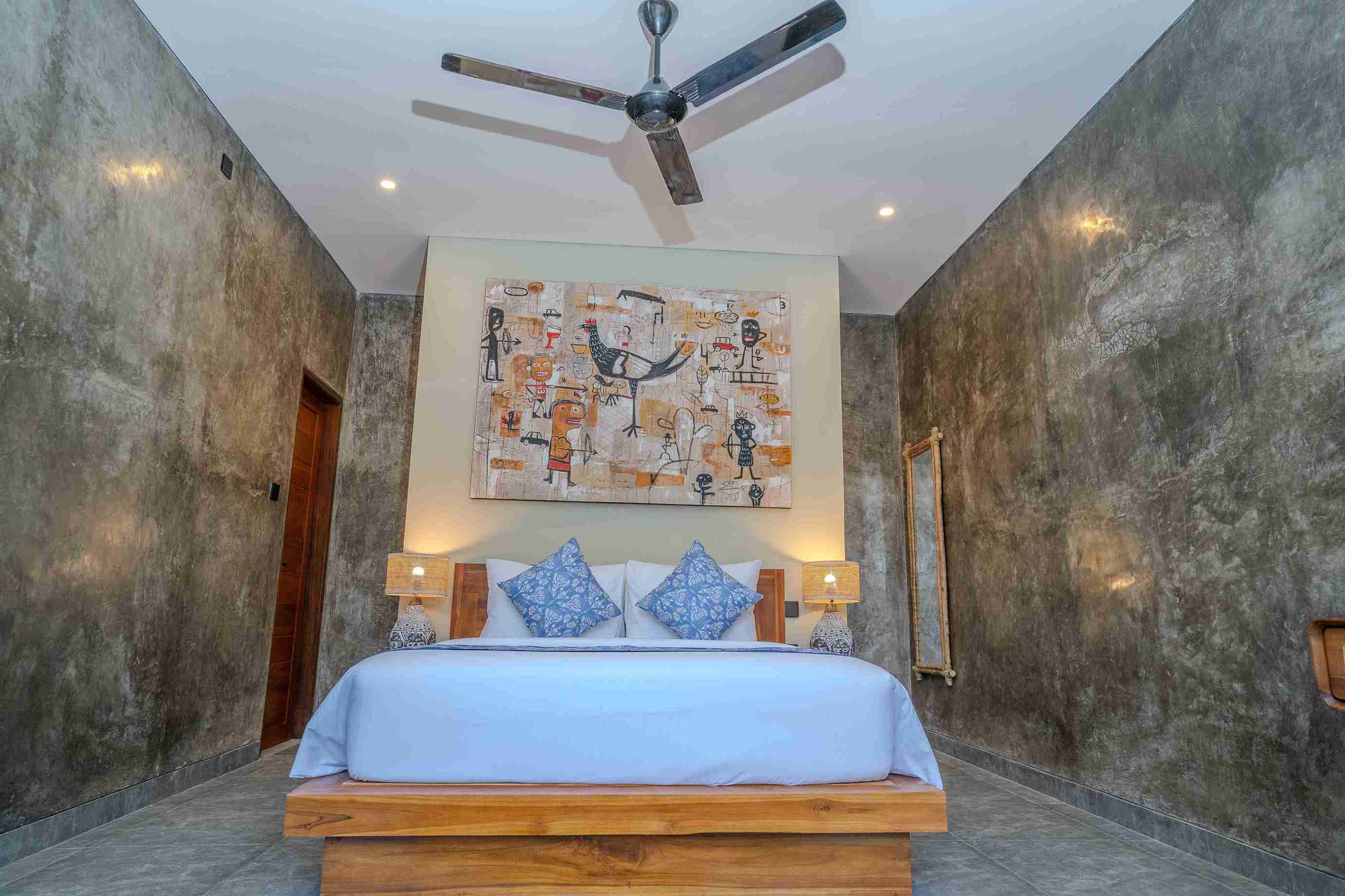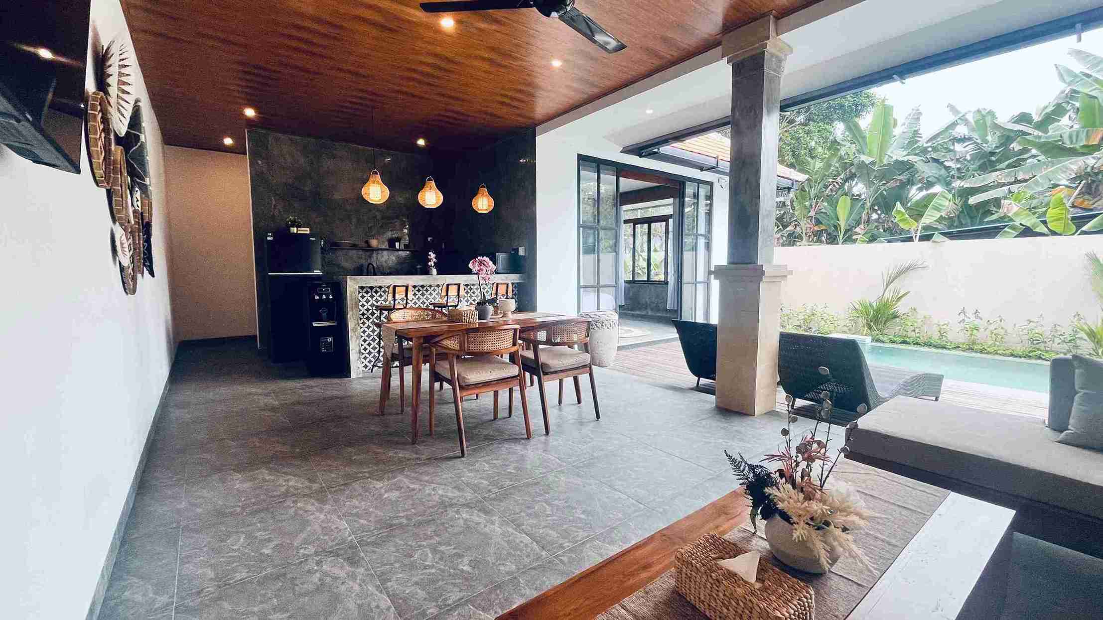 Designed with clean lines and polished cement finishes, the villa offers a minimalist yet warm atmosphere that’s both trendy and tranquil. The open-plan living and dining area flows seamlessly to the outdoor space,